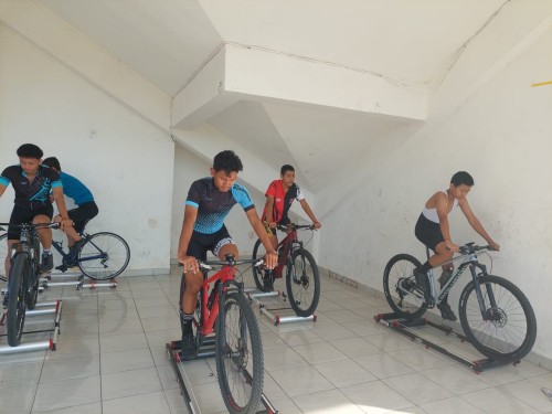 Atlet balap sepeda melaksanakan latihan cadance dengan menggunakan roll trainner di GOR Bhuwana Patra Singaraja....