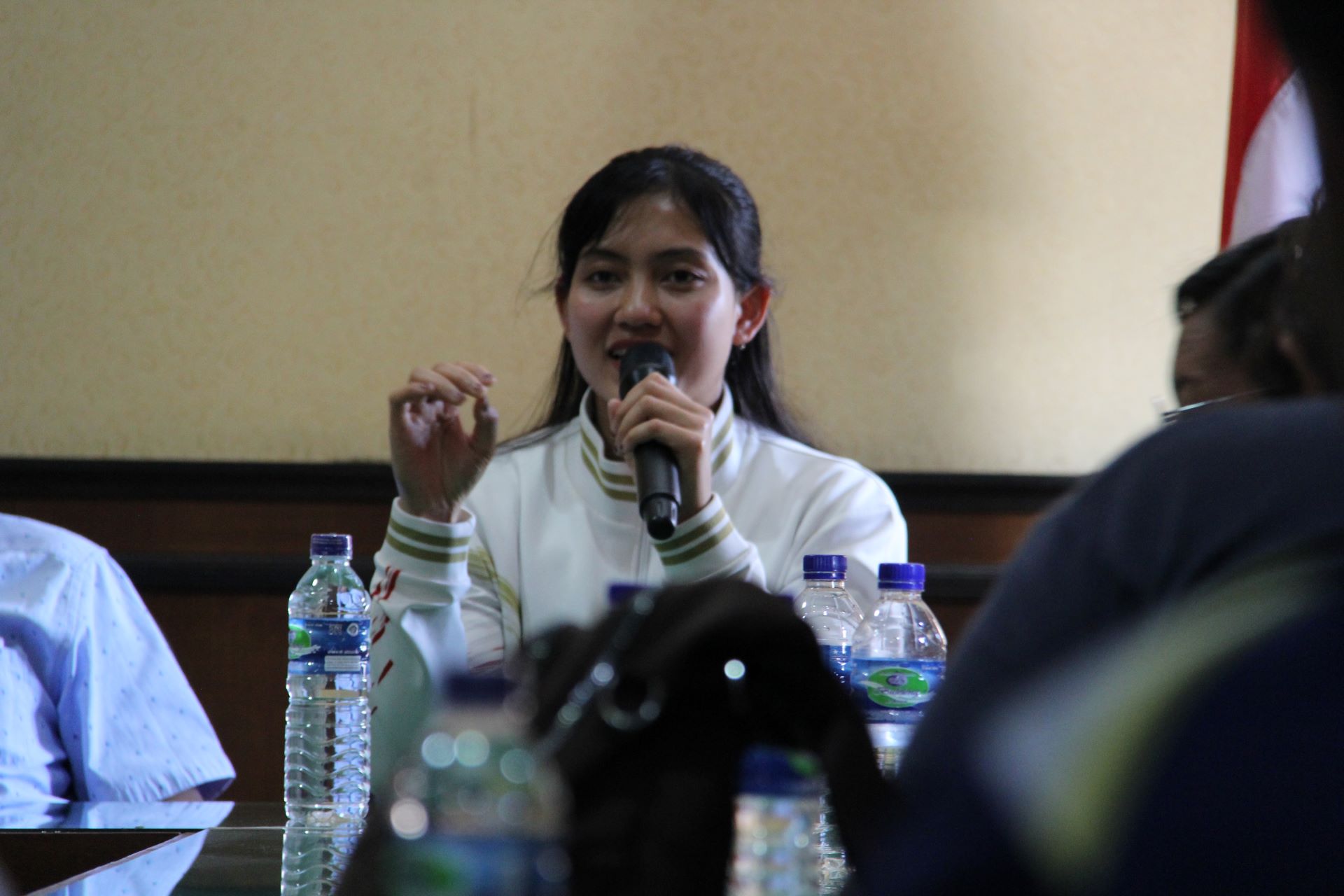 Pengurus KONI Buleleng berbincang santai dengan Atlet FPTI asal Desa Sambangan, Kecamatan Sukasada, Buleleng Desa Made Rita Kusuma Dewi di kantor KONI....