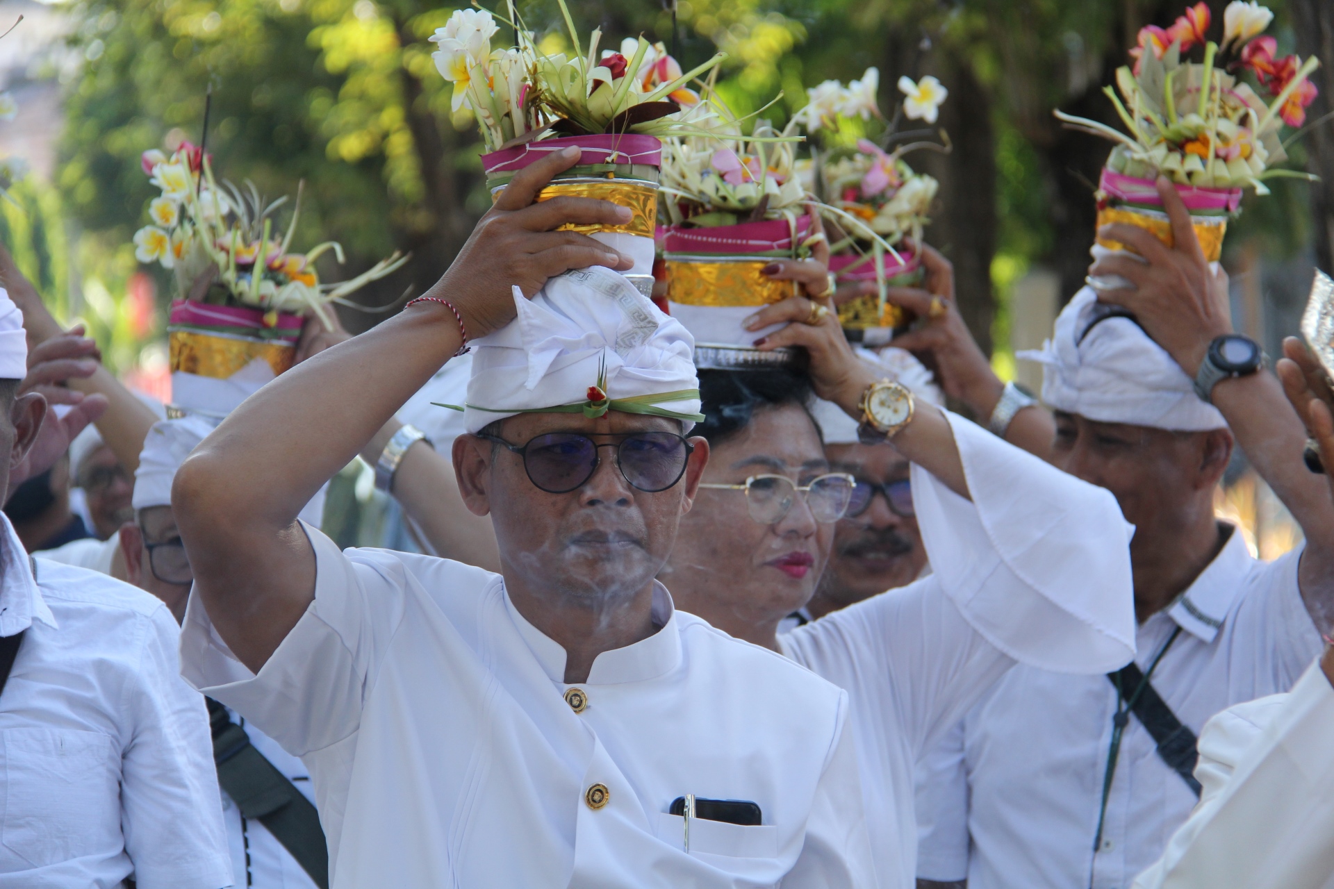 Jajaran Pengurus KONI Buleleng, Kabupaten Buleleng melaksanakan persembahyangan bersama dalam piodalan di Pura Cakra Bhuwana, KONI Buleleng, bertepata....